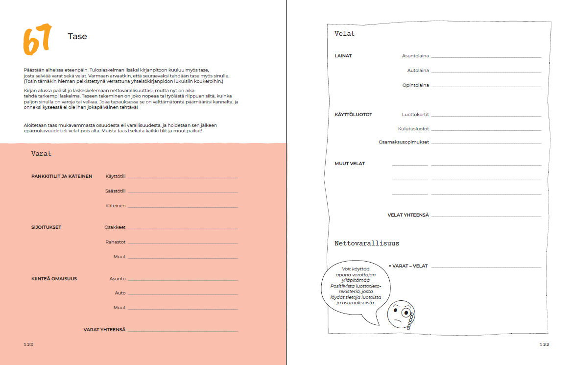 HELPPOUS: Kirjan tehtävät on suunniteltu siten, että niihin on helppo tarttua, eikä sinun tarvitse tietää, mistä aloittaa. Jokainen taloudenhallinnan kannalta tärkeä asia ja osa-alue käydään läpi yksi kerrallaan.