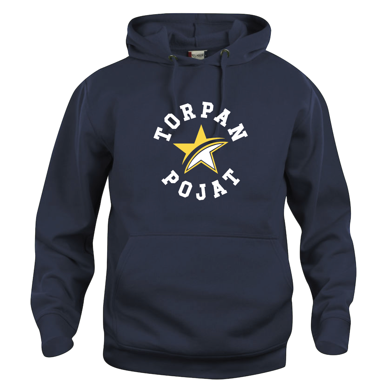 Cliquen rento aikuisten huppari. Resori helmassa ja hihansuissa. Edessä kengurutasku, jonka sisäpuolella aukko kuulokejohtoa varten.
