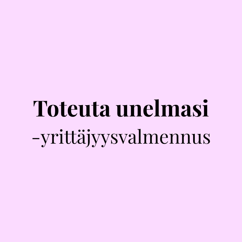 Toteuta unelmasi -yrittäjyysvalmennus on 6 viikon verkkovalmennus naisyrittäjille, jotka haluavat löytää yrittäjänä oman äänensä ja tulla näkyviksi sekä kehittää omaa liiketoimintaa niin, että se tukee omia arvoja. Valmennuksen jälkeen tunnet itsesi rohkeaksi, inspiroituneeksi ja varmaksi itsesi ja yrityksesi suhteen sekä olet jo aloittanut viemään yritystäsi uudelle tasolle. 6 viikkoa oivalluksia, käytännön tehtäviä, rohkeutta ja kasvua. Tässä valmennuksessa kirkastat yrityksesi sydämen ja rakennat sen ympärille vahvan, oman näköisen suunnan.