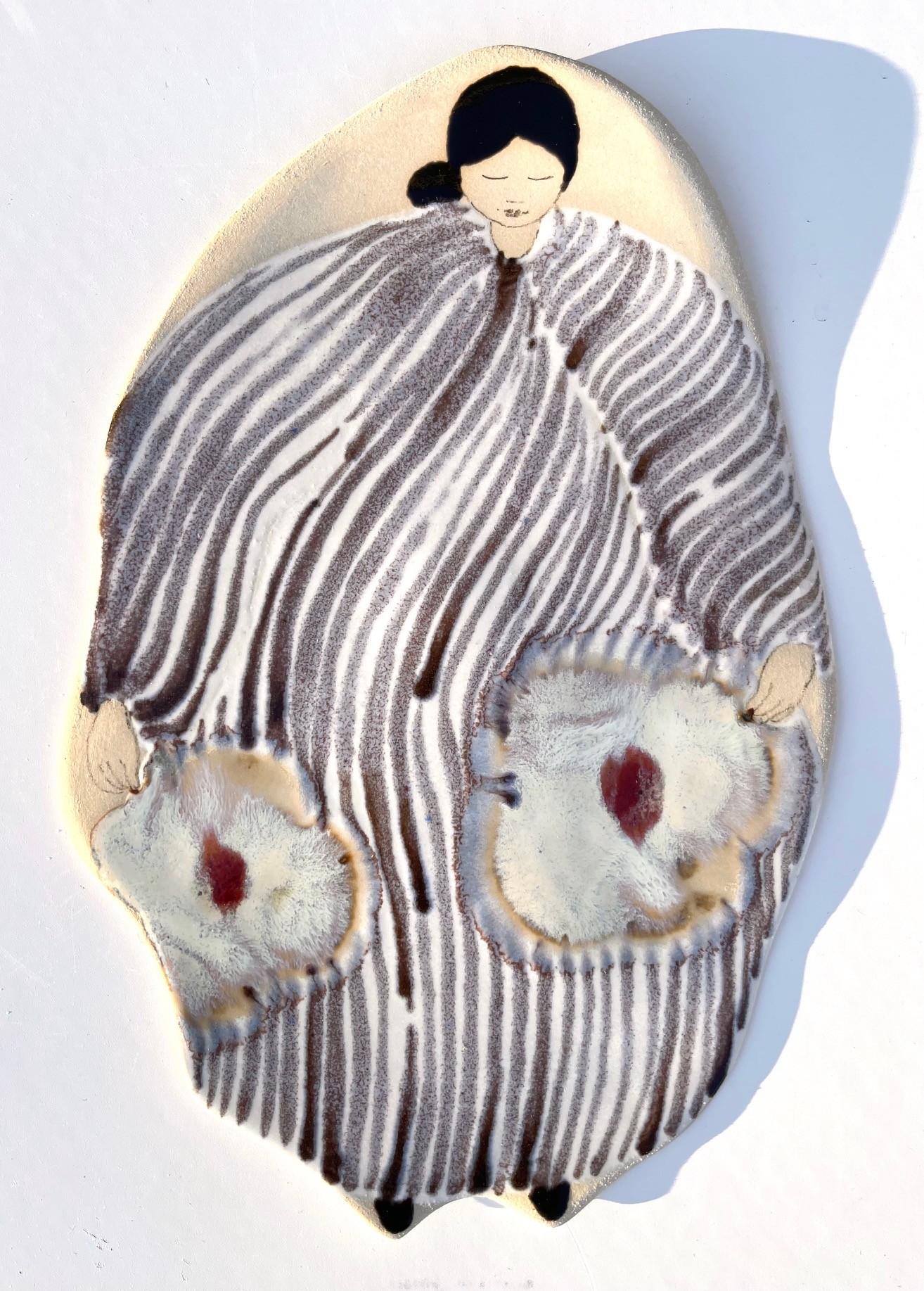 Teos on lievästi kakkoslaatuinen: teos taittunut oikeasta yläkulmasta poltossa. Koko: 25 x 16,5 cm. 2026. Lasitettu kivitavara. Teos on signeerattu ja työn takana on kiinnitysosa valmiina. Postitus kuuluu teoksen hintaan. Myös nouto on mahdollinen työhuoneeltani Sipoosta.