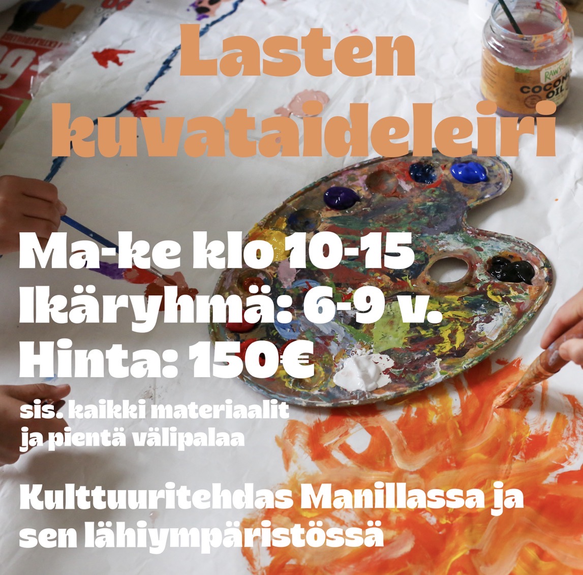 Info: Ajankohta: 1.-3.6. klo 10-15 Ikäryhmä: 6-9 v. Hinta: 150€ sis materiaalit ja välipalan Sijainti: Kulttuuritehdas Manilla ja sen ympäristö