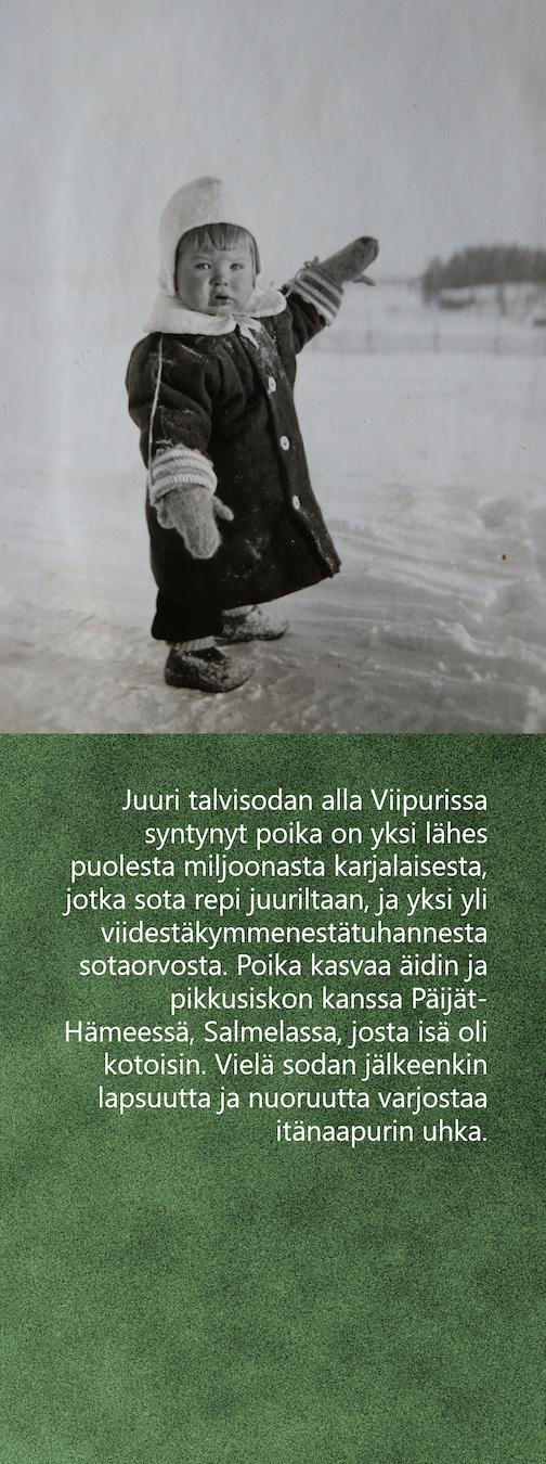 Juuri talvisodan alla Viipurissa syntynyt poika on yksi lähes puolesta miljoonasta karjalaisesta, jotka sota repi juuriltaan, ja yksi yli viidestäkymmenestätuhannesta sotaorvosta.