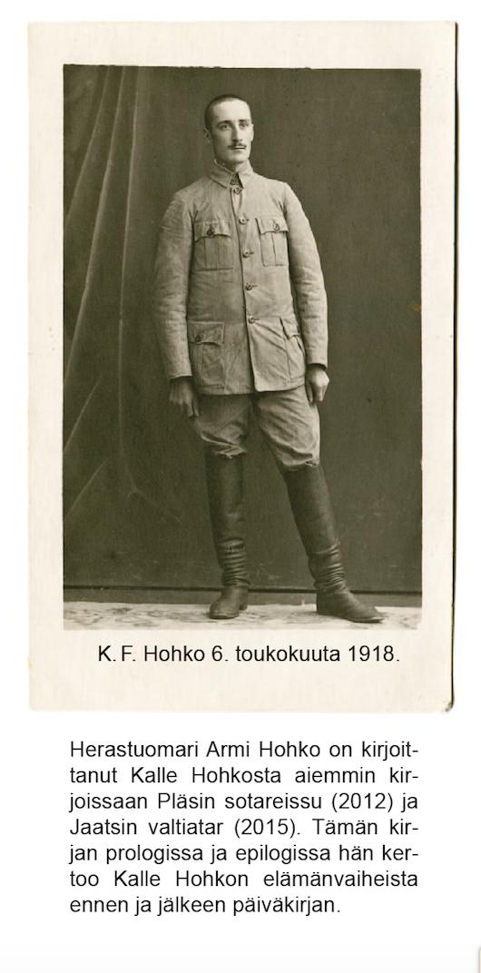 Herastuomari Armi Hohko on kirjoittanut Kalle Hohkosta aiemmin kirjoissaan Pläsin sotareissu (2012) ja Jaatsin valtiatar (2015). Tämän kirjan prologissa ja epilogissa hän kertoo Kalle Hohkon elämänvaiheista ennen ja jälkeen päiväkirjan.