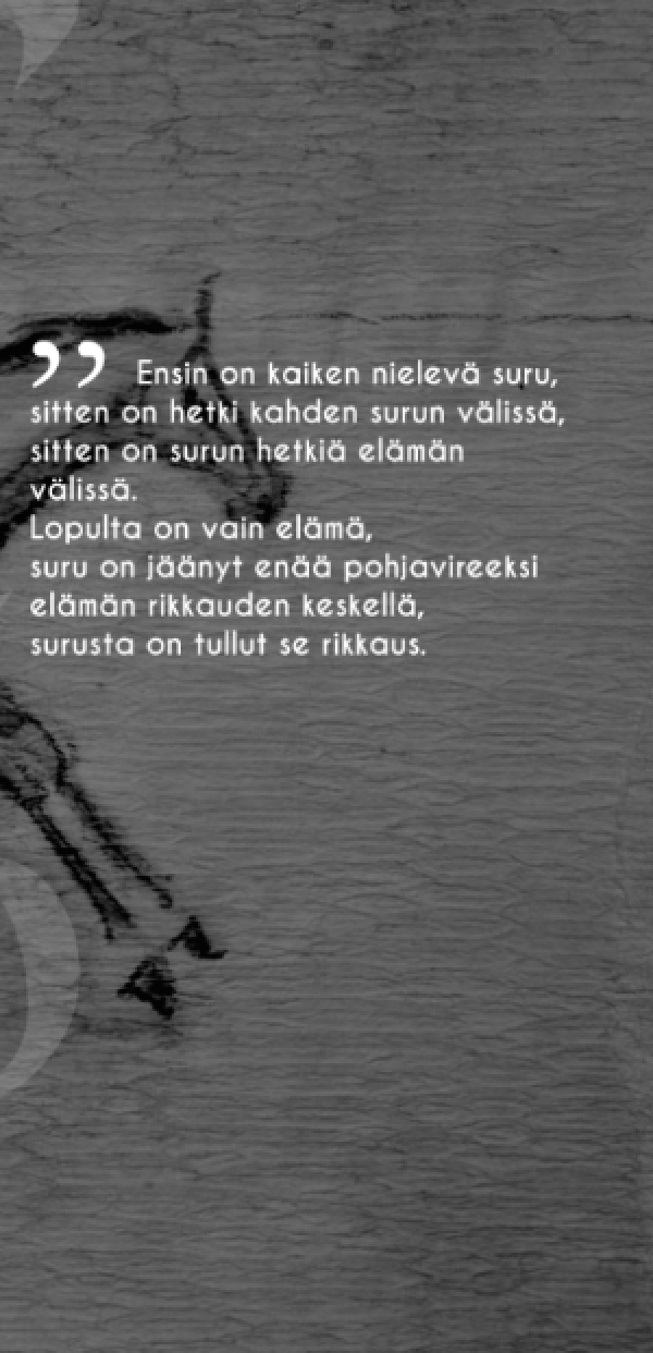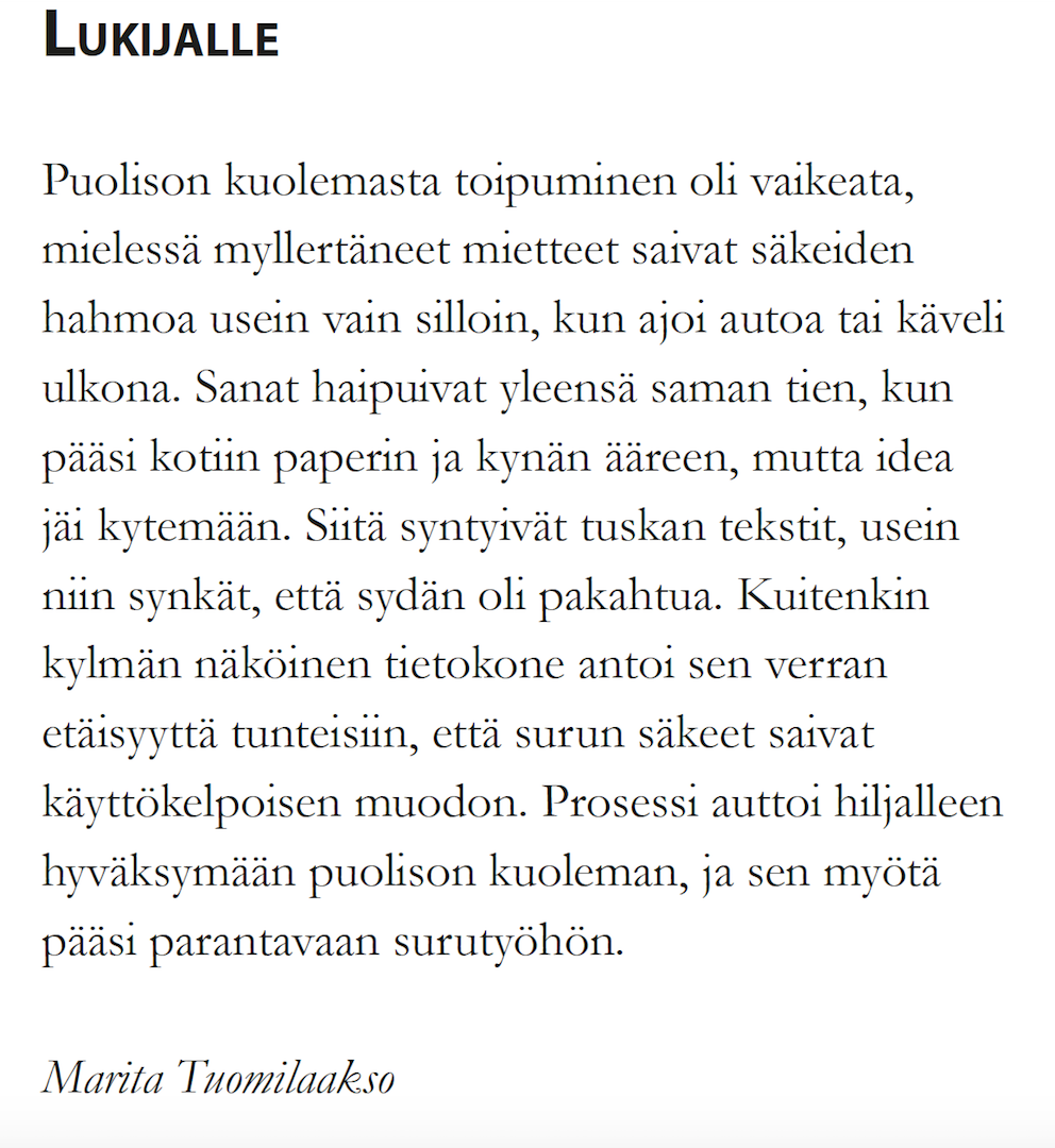 Marita Tuomilaakson runot ja ajatelmat nousevat omasta suuresta surusta, puolison menetyksestä.