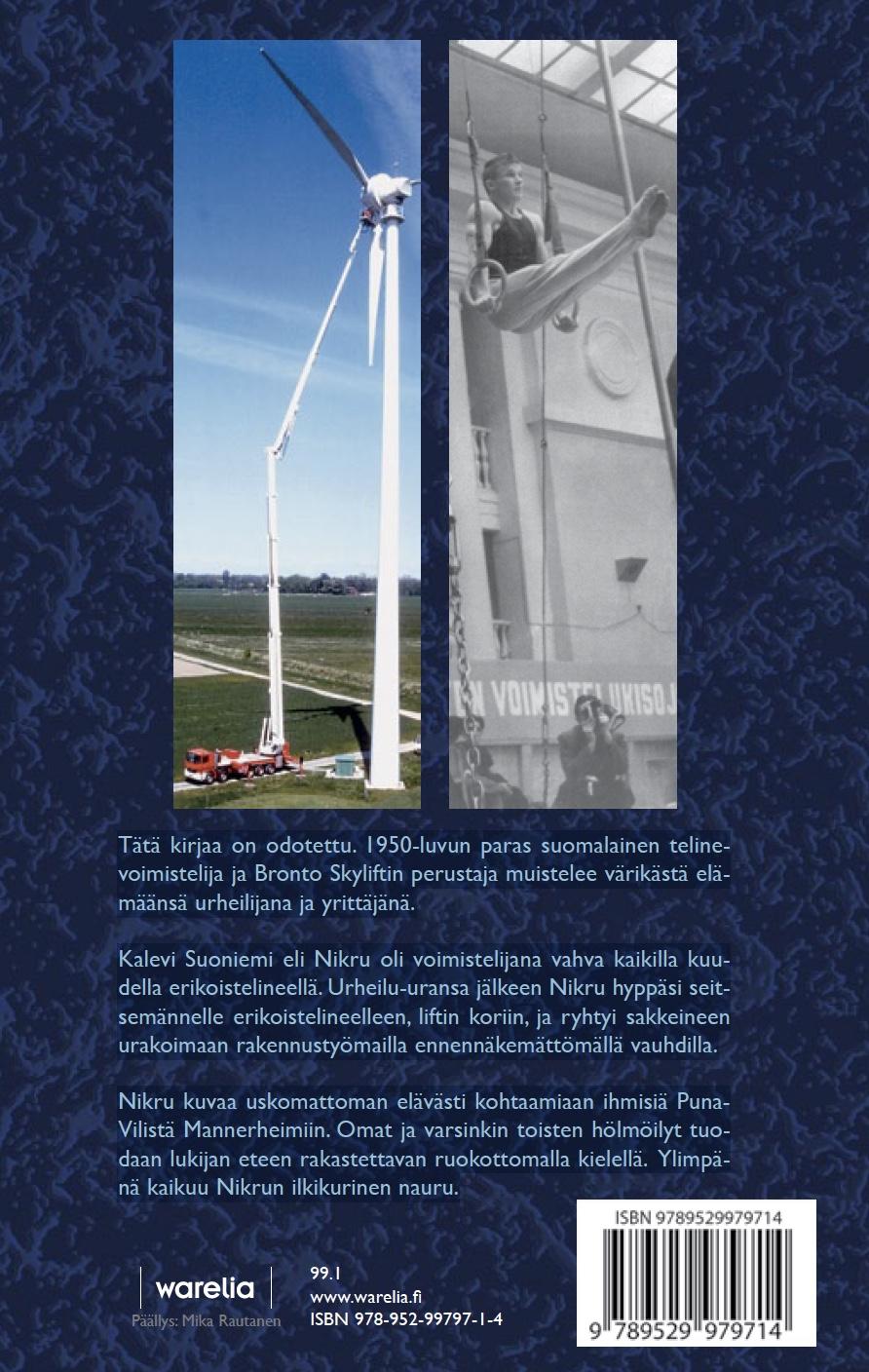 "Tätä kirjaa on odotettu. 1950-luvun paras suomalainen telinevoimistelija ja Bronto Skyliftin perustaja muistelee värikästä elämäänsä urheilijana ja yrittäjänä.