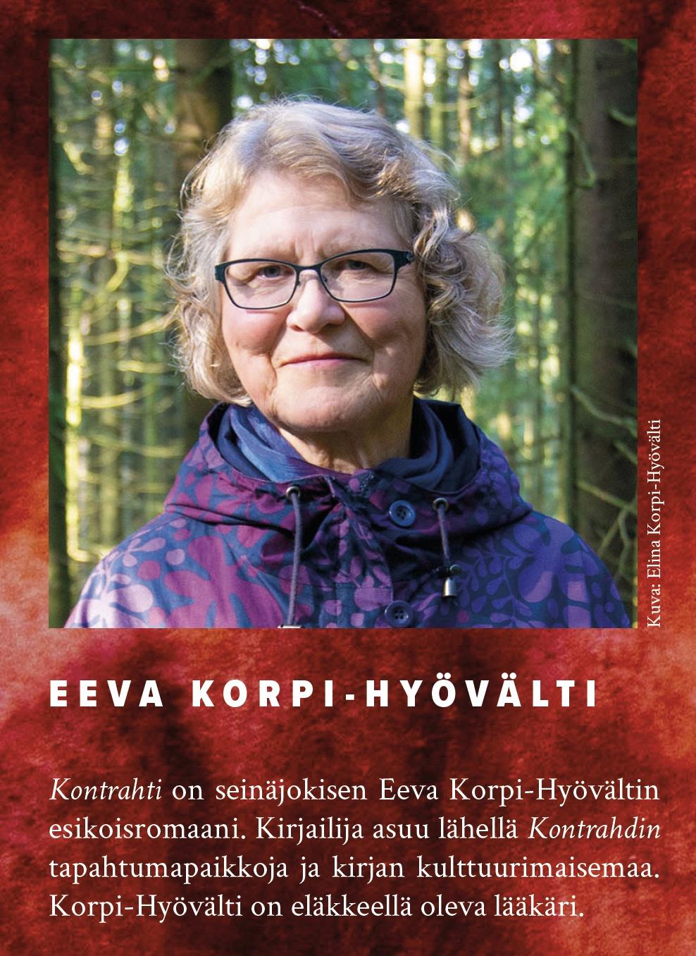 Kontrahti on seinäjokisen Eeva Korpi-Hyövältin esikoisromaani. Kirjailija asuu lähellä Kontrahdin tapahtumapaikkoja ja kirjan kulttuurimaisemaa. Korpi-Hyövälti on eläkkeellä oleva lääkäri.