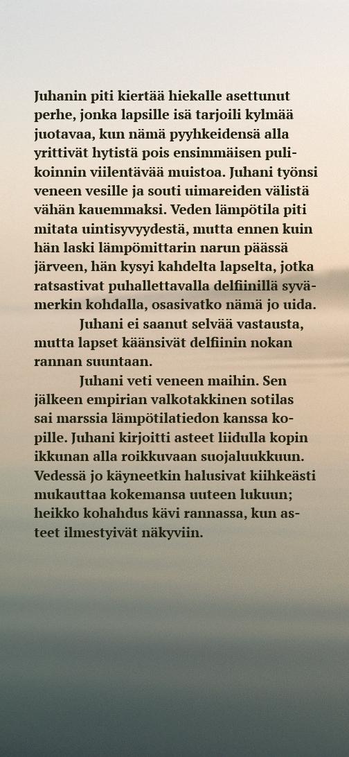 Katso kirjailijan esittelyä ja lue näyte romaanista: klikkaa kansikuvan vieressä olevaa >-merkkiä.
