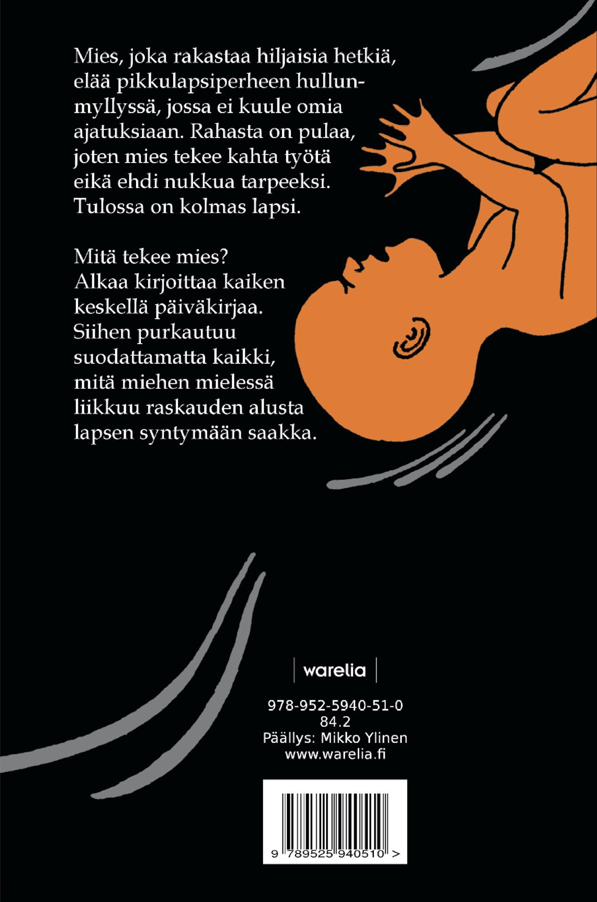 Mitä tekee mies? Alkaa kirjoittaa kaiken keskellä päiväkirjaa. Siihen purkautuu suodattamatta kaikki, mitä miehen mielessä liikkuu raskauden alusta lapsen syntymään saakka.