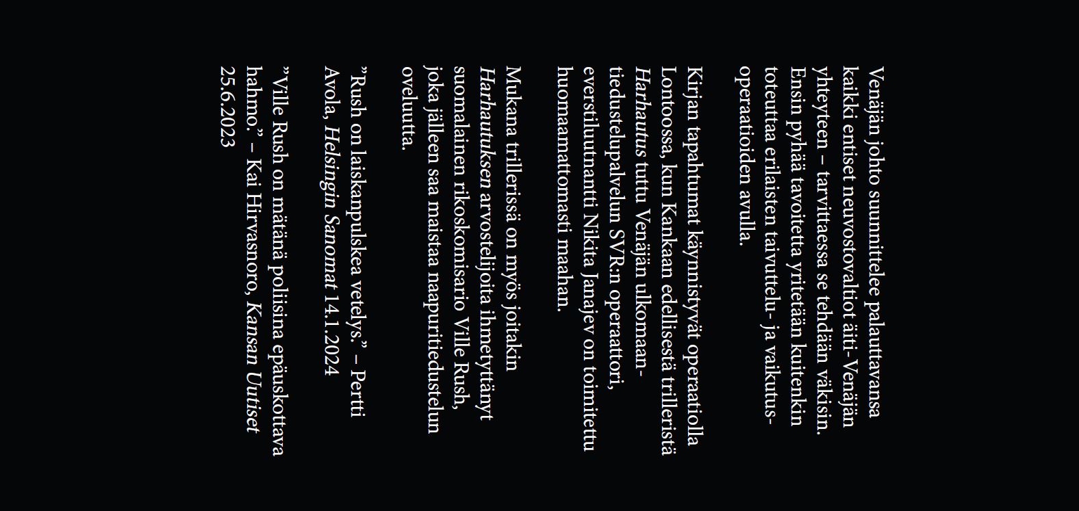 Mukana trillerissä on myös joitakin Harhautuksen arvostelijoita ihmetyttänyt suomalainen rikoskomisario Ville Rush, joka jälleen saa maistaa naapuritiedustelun oveluutta.