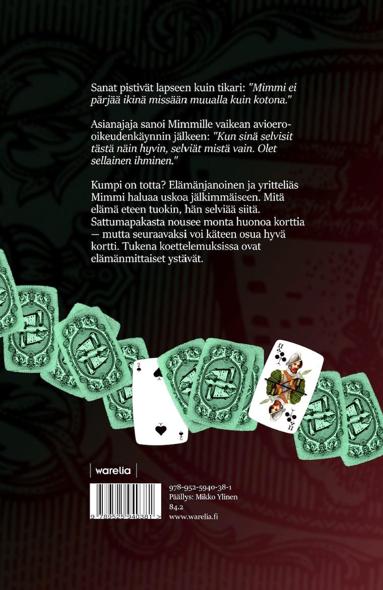 Kumpi on totta? Elämänjanoinen ja yritteliäs Mimmi haluaa uskoa jälkimmäiseen. Mitä elämä eteen tuokin, hän selviää siitä. Sattumapakasta nousee monta huonoa korttia — mutta seuraavaksi voi käteen osua hyvä kortti. Tukena koettelemuksissa ovat elämänmittaiset ystävät.