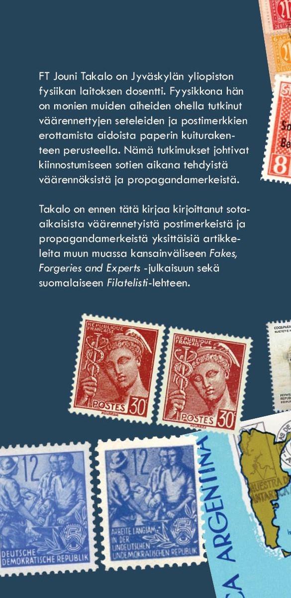 Jouni Takalo on Jyväskylän yliopiston fysiikan laitoksen dosentti. Fyysikkona hän on monien muiden aiheiden ohella tutkinut väärennettyjen seteleiden ja postimerkkien erottamista aidoista paperin kuiturakenteen perusteella. Nämä tutkimukset johtivat kiinnostumiseen sotien aikana tehdyistä väärennöksistä ja propagandamerkeistä.