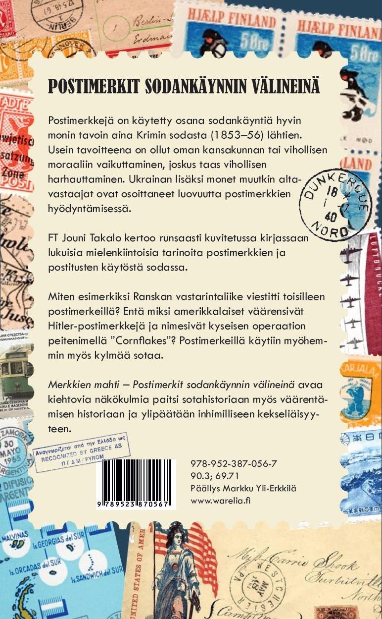 FT Jouni Takalo kertoo runsaasti kuvitetussa kirjassaan lukuisia löytämiään mielenkiintoisia tarinoita postimerkkien ja postitusten käytöstä sodassa. Monet muutkin altavastaajat Ukrainan lisäksi ovat osoittaneet luovuutta postimerkkien hyödyntämisessä. Merkkien mahti – Postimerkit sodankäynnin välineinä avaa kiehtovia näkökulmia paitsi sotahistoriaan myös väärentämisen historiaan ja ylipäätään inhimilliseen kekseliäisyyteen.