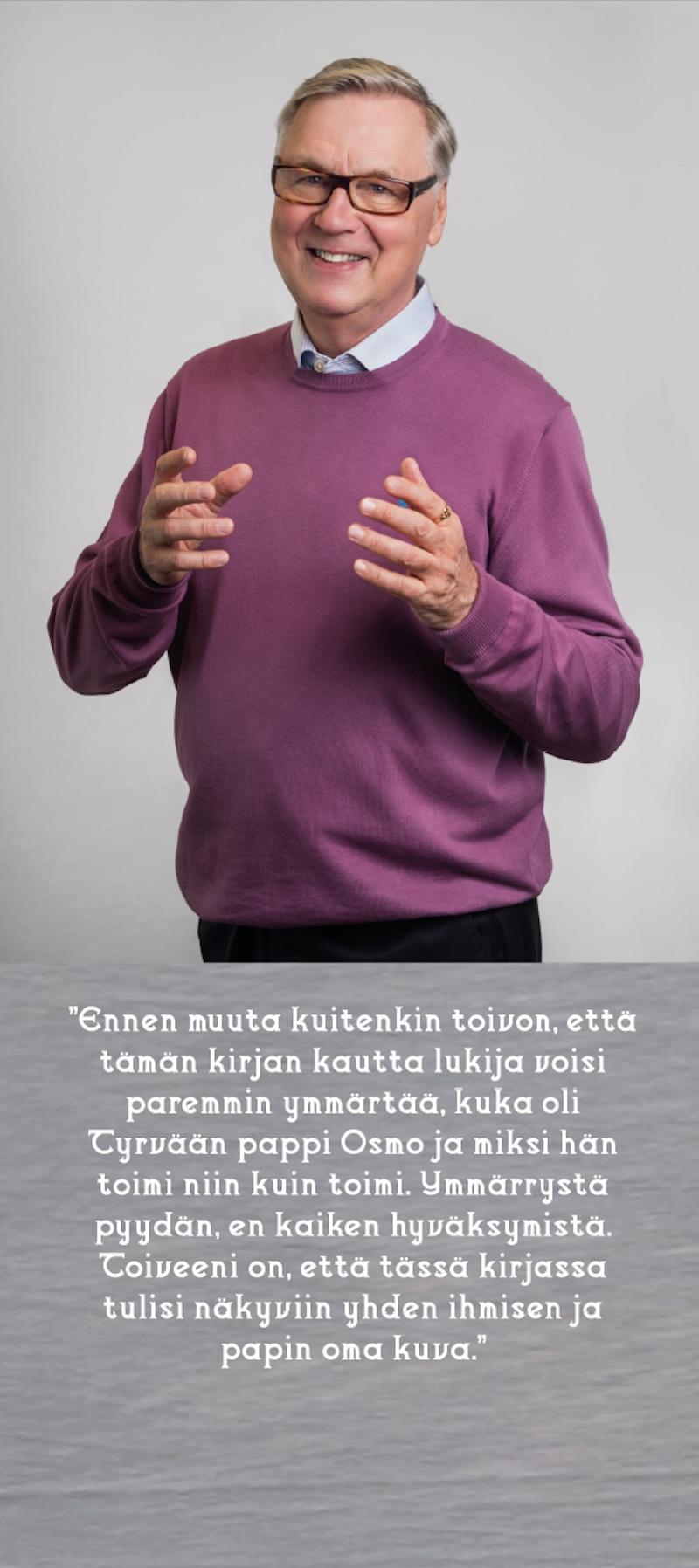 "Ennen muuta kuitenkin toivon, että tämän kirjan kautta lukija voisi paremmin ymmärtää, kuka oli Tyrvään pappi Osmo ja miksi hän toimi niin kuin toimi. Ymmärrystä pyydän, en kaiken hyväksymistä. Toiveeni on, että tässä kirjassa tulisi näkyviin yhden ihmisen ja papin oma kuva."