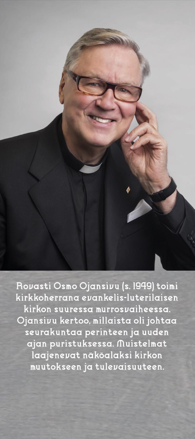 Rovasti Osmo Ojansivu (s. 1949) toimi kirkkoherrana evankelis-luterilaisen kirkon suuressa murrosvaiheessa. Ojansivu kertoo, millaista oli johtaa seurakuntaa perinteen ja uuden ajan puristuksessa. Muistelmat laajenevat näköalaksi kirkon muutokseen ja tulevaisuuteen.