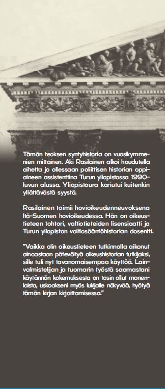 Aki Rasilainen toimii hovioikeudenneuvoksena Itä-Suomen hovioikeudessa. Hän on oikeustieteen tohtori, valtiotieteiden lisensiaatti ja Turun yliopiston valtiosääntöhistorian dosentti.