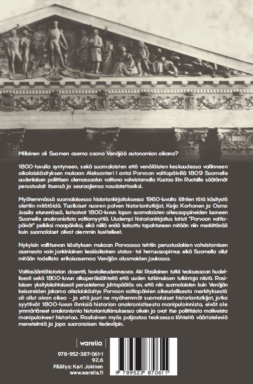 Aki Rasilainen: Porvoon valtiopäivien poiskirjoitettu historia. Miten Venäjän keisarit suhtautuivat Suomen valtiolliseen autonomiaan. NYT SAATAVILLA! Postitus vain Suomeen.