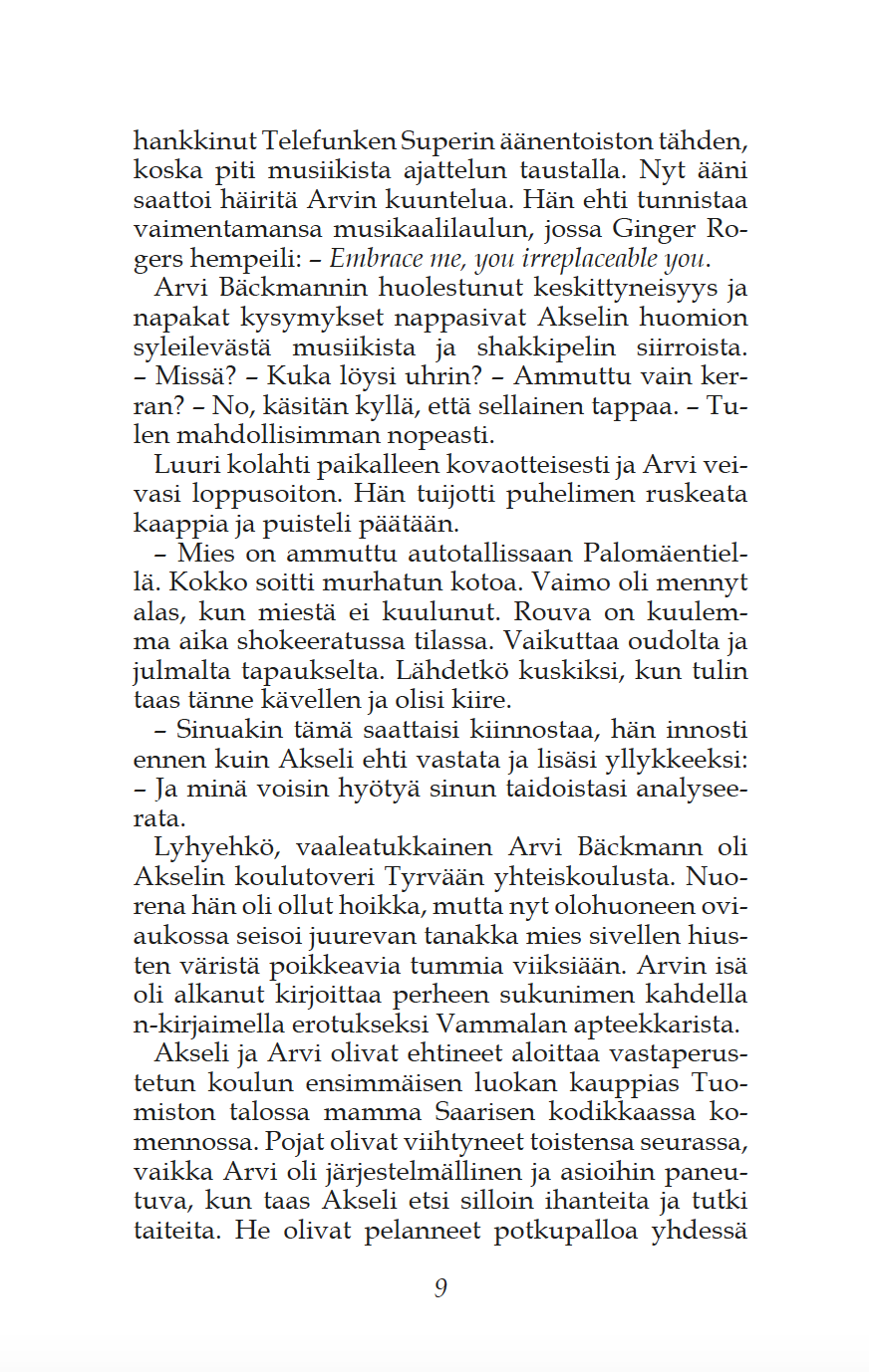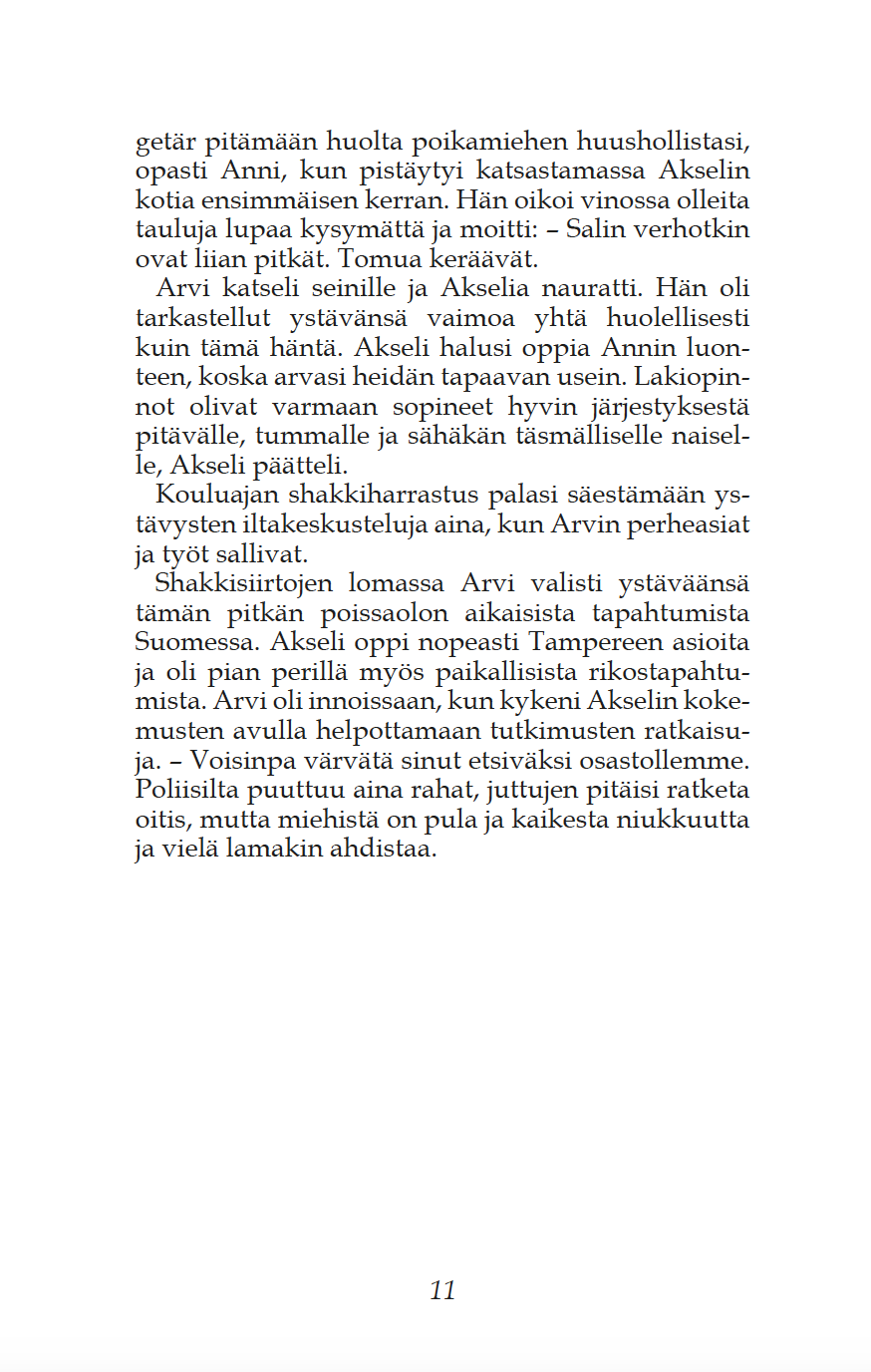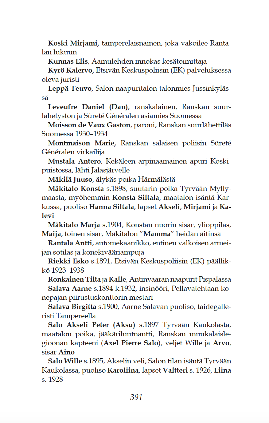 Romaanin päähenkilönä seikkailee Tyrväästä kotoisin oleva jääkäriupseeri Akseli Salo, jonka nuoruuden ystävä, rikoskomisario tutkii Tampereella murhatapausta. Salo on lähtenyt sisällissodan jälkeen ulkomaille ja palvellut 1920-luvulla Ranskan muukalaislegioonassa. - - Välillä muistellaan vuoden 1918 verisiä tapahtumia Tyrväässä, ajetaan Karkun mäkisissä maastoissa ja yövytään Liekorannassa. On neuvostovakoilua, saksalaisia kauppiaita ja hiukan myös romantiikkaa. Mika Lampi, Tyrvään Sanomat 26.9.2020.