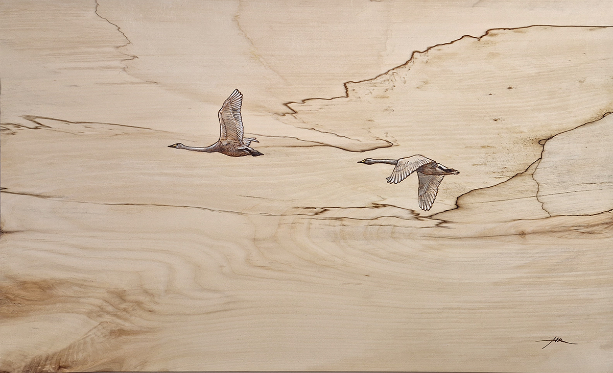 Puutaulu, jossa laulujoutsenia. Tekotapa: pyrografia, vesiväri, guassi, Posca. Pintakäsittely: vaalea öljyvaha. Materiaali: haapa Petäjävedeltä. Koko: 80x49 cm (luonnonreuna) Huom. puutauluissa käytetään laajasti erilaisia puumateriaaleja. Laudoissa voi olla oksia/lahoa/halkeamia, joita on hyödynnetty aiheen toteutuksessa. Suuret laudat myös elävät ja voivat taipua hieman. Ripustusvalmis.