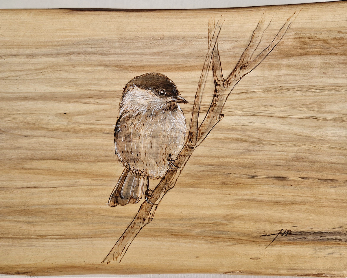 Puutaulu, jossa hömötiainen. Tekotapa: pyrografia, vesiväri, guassi, Posca. Pintakäsittely öljyvaha. Materiaali: Poppeli Kuokkalasta. Koko: 30x n.22 cm (luonnonreuna) Huom. puutauluissa käytetään laajasti erilaisia puumateriaaleja. Laudoissa voi olla oksia/lahoa/halkeamia, joita on hyödynnetty aiheen toteutuksessa. Ripustusvalmis.