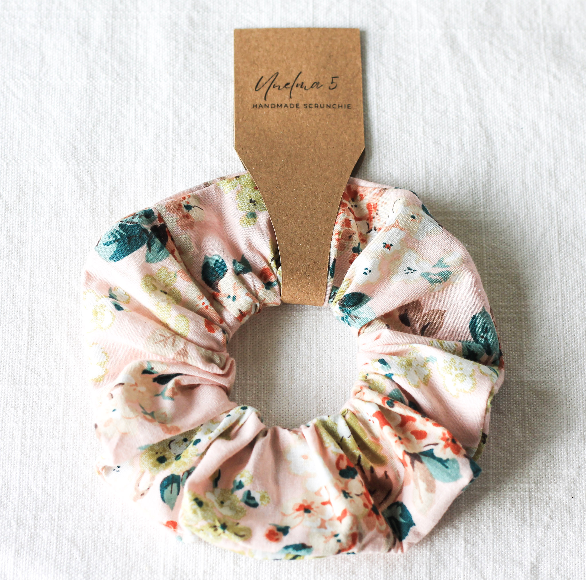 Käsintehty scrunchie eli hiusdonitsi, jossa on hempeän vaaleanpunainen pohja ja kaunis kukkakuosi vihreän, kerman ja oranssin sävyissä. Kangas on pehmeää puuvillasekoitetta, mikä tekee donitsista hiuksille hellävaraisen ja hyvin paikallaan pysyvän. Sopii erinomaisesti niin arkikäyttöön kuin juhla-asuun, ja toimii myös rannekorumaisena yksityiskohtana hiusten ollessa auki.