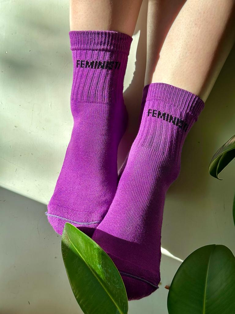 VIIMEISET PARIT ALENNUKSELLA! Ovh 15,00 euroa. Näytä aate jalassa! Violetinväriset sukat mustalla FEMINISTI-tekstillä loistavat kauas. Kestävä urheilusukka sisältää 80% puuvillaa, 15% polyamidia ja 5% elastaania. Valmistaja: Mi-sukka, Mikkeli.