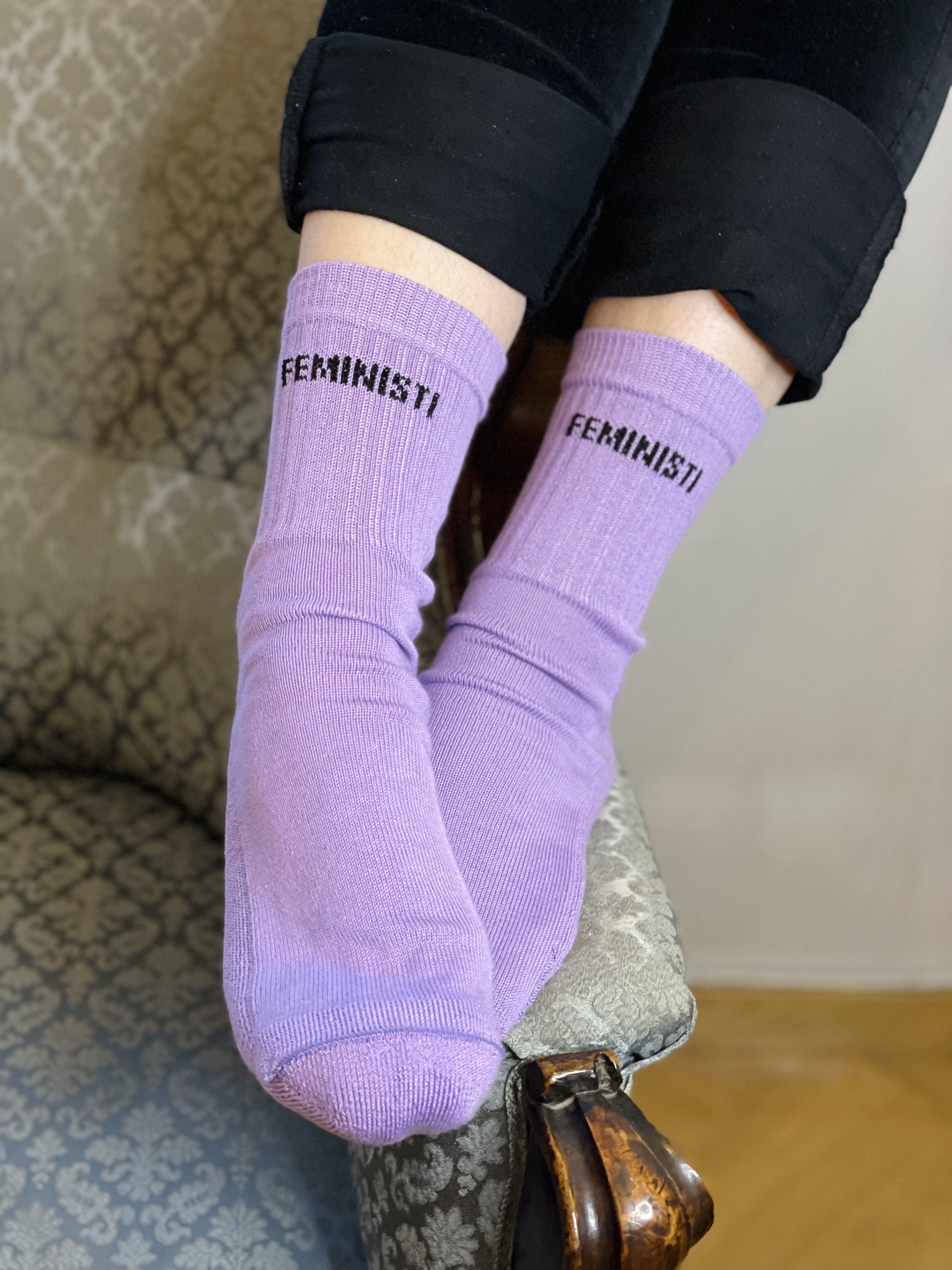 Näytä aate jalassa! Musta FEMINISTI-teksti loistaa laventelinvärisissä sukissa. Kestävä urheilusukka sisältää 80% puuvillaa, 15% polyamidia ja 5% elastaania. Valmistaja: Mi-sukka, Mikkeli.
