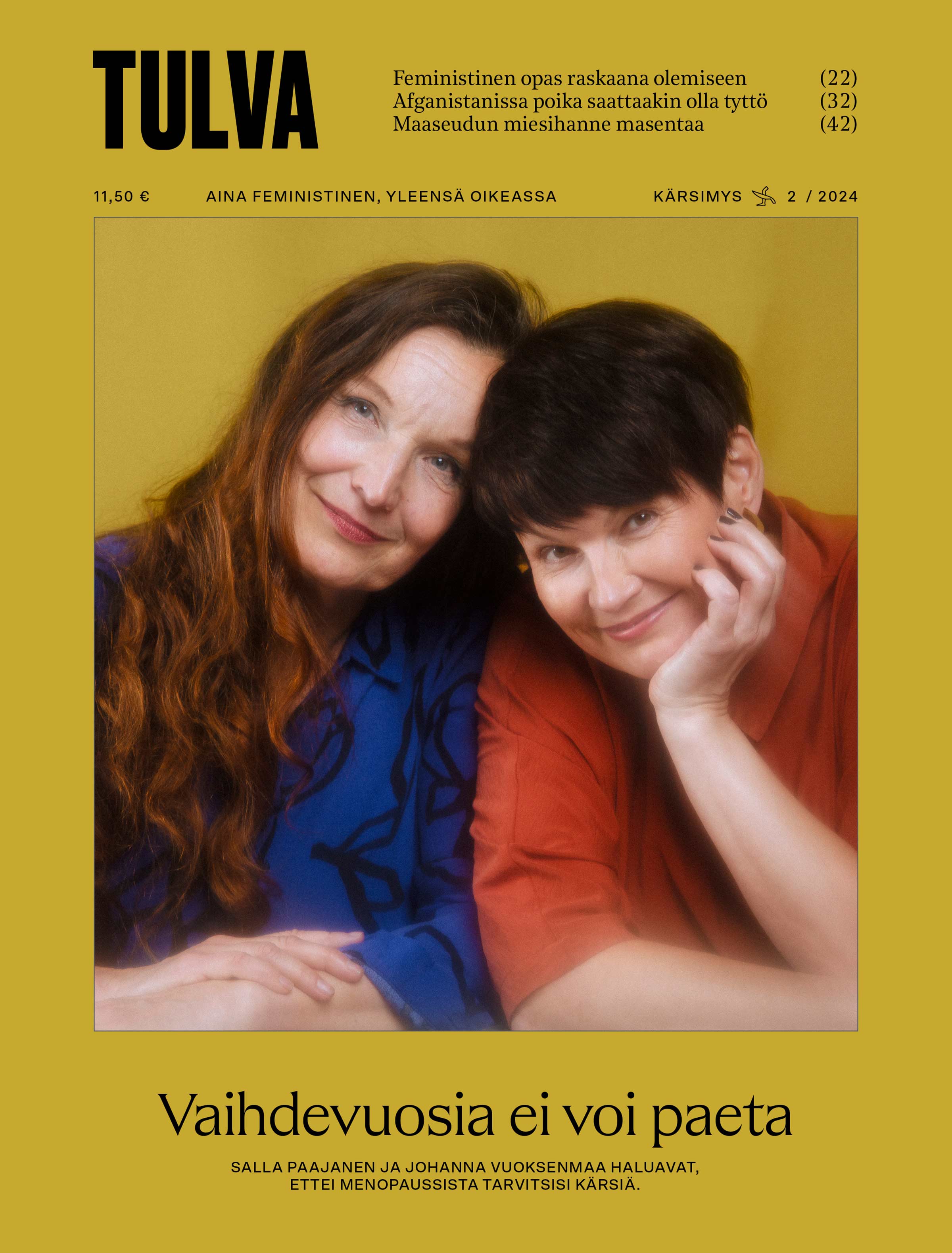 Koko Suomen odotetuimman feministisen aikakauslehden toinen numero on täällä! Tässä Tulvan numerossa sukellamme syvälle kärsimykseen. Kansijutussa Salla Paajanen ja Johanna Vuoksenmaa kertovat vaihdevuosista ja rikkovat tabuja aiheen ympärillä. Lisäksi numerossa pureskellaan niin raiskausta, politiikkaa kuin sukupuoliroolejakin.