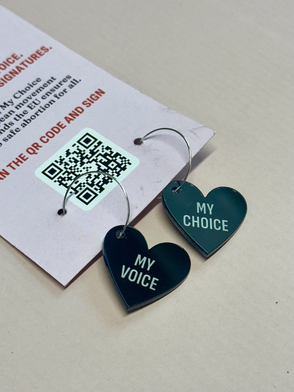 Mustat sydänkorvakorut My Voice My Choice tekstillä!