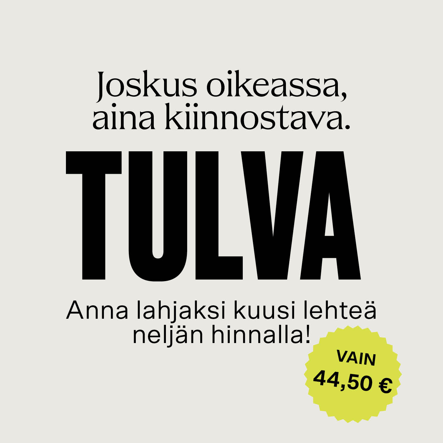 Anna lahjaksi ihania lukuhetkiä ja ilahdutat varmasti! Vuonna 2026 Tulva ilmestyy 4 kertaa ja ensimmäinen numero ilmestyy helmikuussa.
