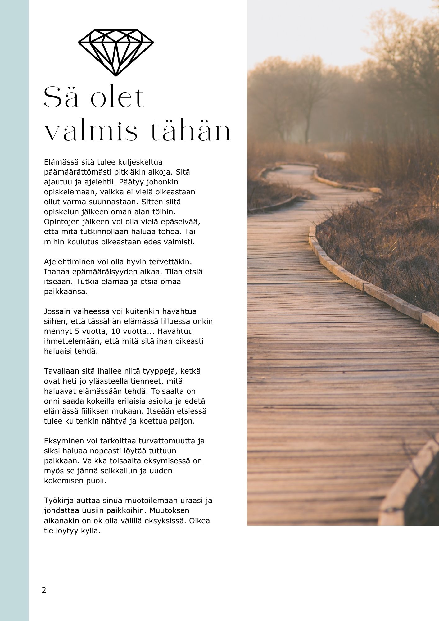 Tavoitteen määrittäminen on tärkeää, kun tavoittelee uutta suuntaa elämässä. Työkirjassa saat luoda kansainvälisesti tunnetun mallin mukaisen tavoitteen itsellesi. Tavoitteen laatiminen parantaa tutkitusti mahdollisuuksia saavuttaa unelmat.