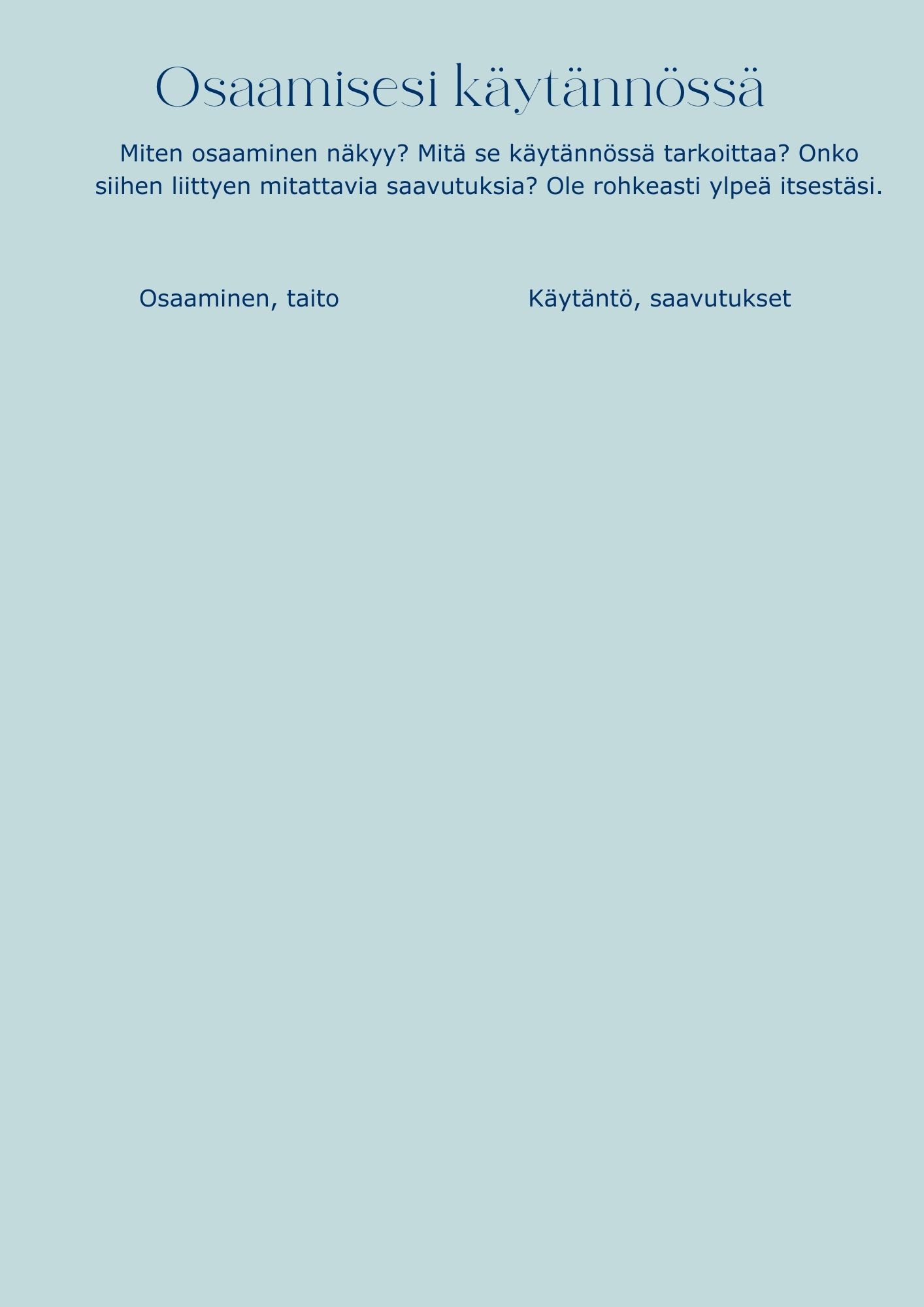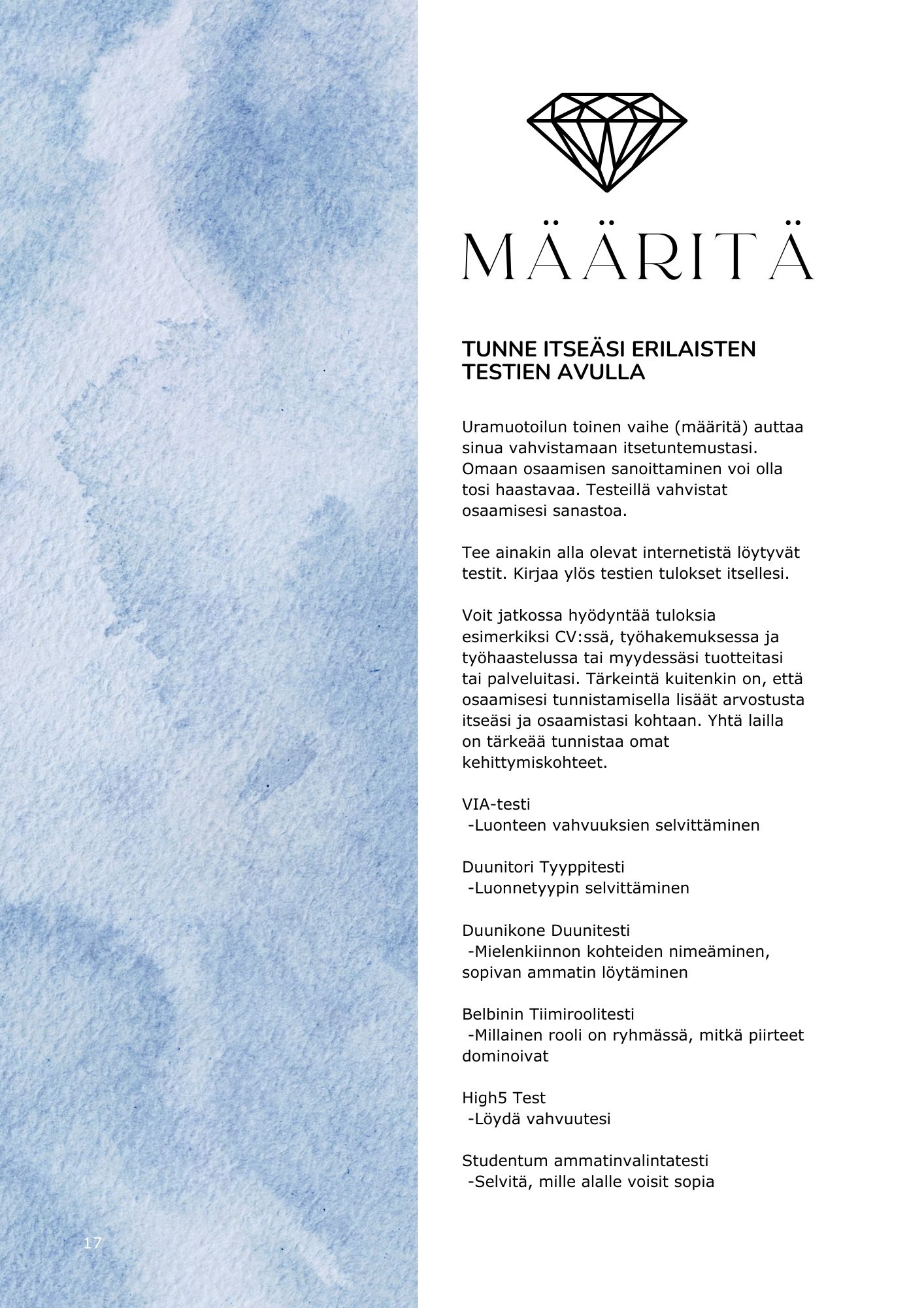 Työkirjan avulla tulet tietoiseksi osaamisestasi ja osaat kertoa siitä. Opit myös tunnistamaan kehityskohteesi, jotta voit tulla vieläkin upeammaksi ammattilaiseksi. Löydät lisää itseluottamusta ja arvostuksesi itseäsi kohtaan nousee.