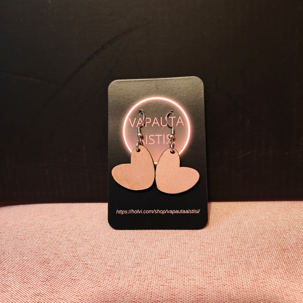 Kevyet, kotimaiset, käsintehdyt vanerikorvakorut herkille aisteille. Tehty rauhassa, pienissä erissä. Teräsosat allergisoimatonta kirurginterästä. Sydämen koko n.25mm