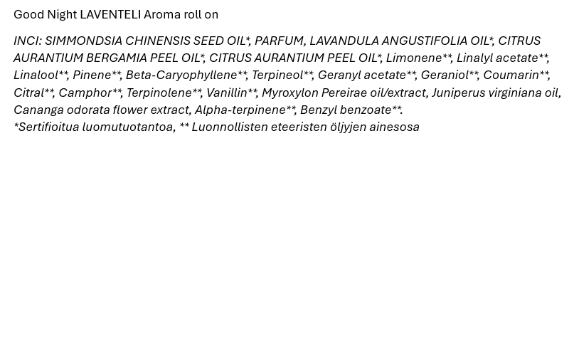 Good night LAVENTELI aroma roll on ihana hyvän yön roll on. Roll on käyttövalmis sellaisenaan iholle illalla kun alat laskeutumaan uneen. Mieto yhdistelmä luomu eteerisiä öljyjä, mm. laventeli, vanilja, bergamotti, appelsiini ja tonkapapu yhdistettynä hoitavaan luomu jojobaöljyyn rauhoittaa ja rentouttaa kokonaisvaltaisesti.