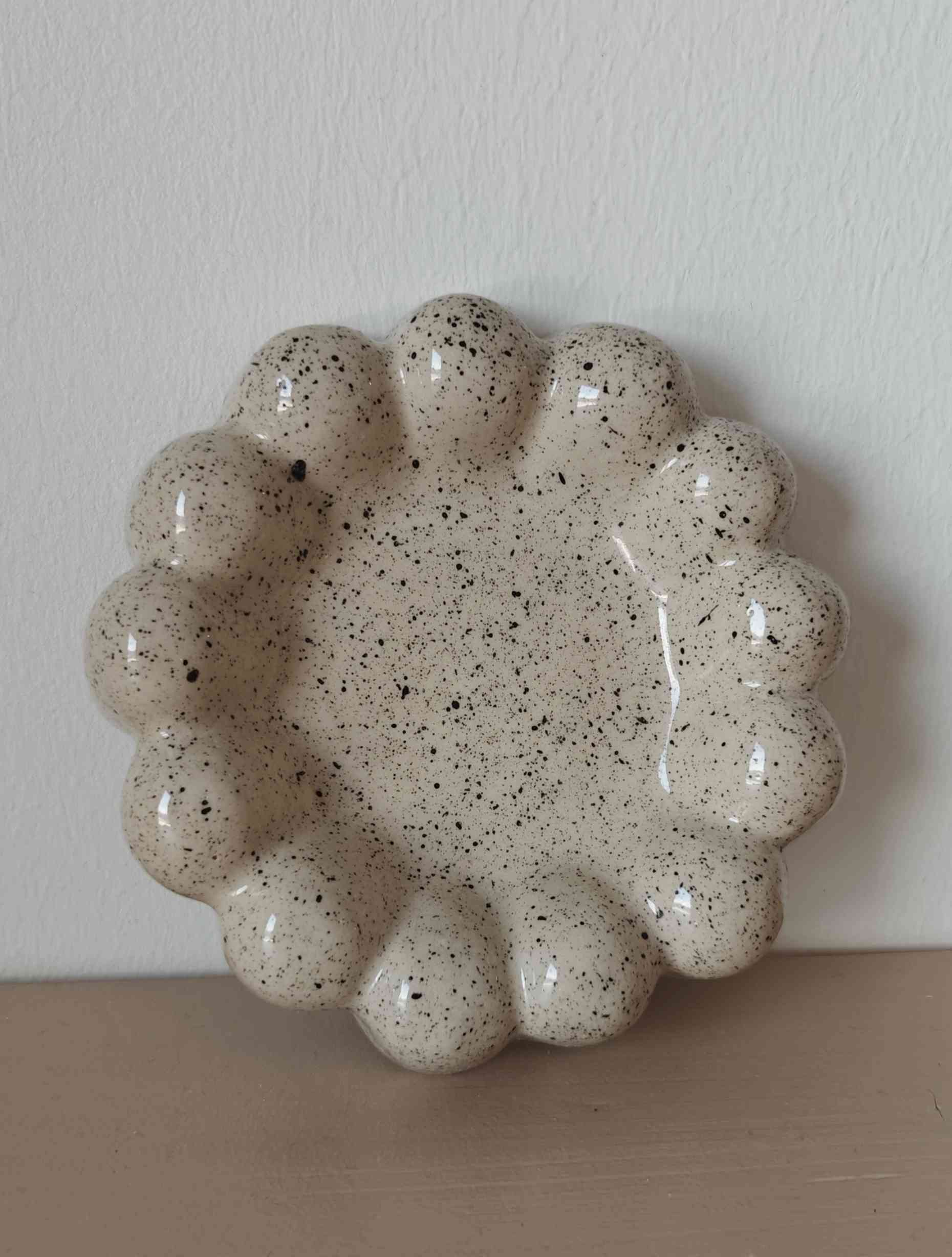 Käsin valusavesta valmistettu lautanen. Lasitettu kirkkaalla elintarvikekättöön soveltuvalla lasitteella. Halkaisija n. 14cm