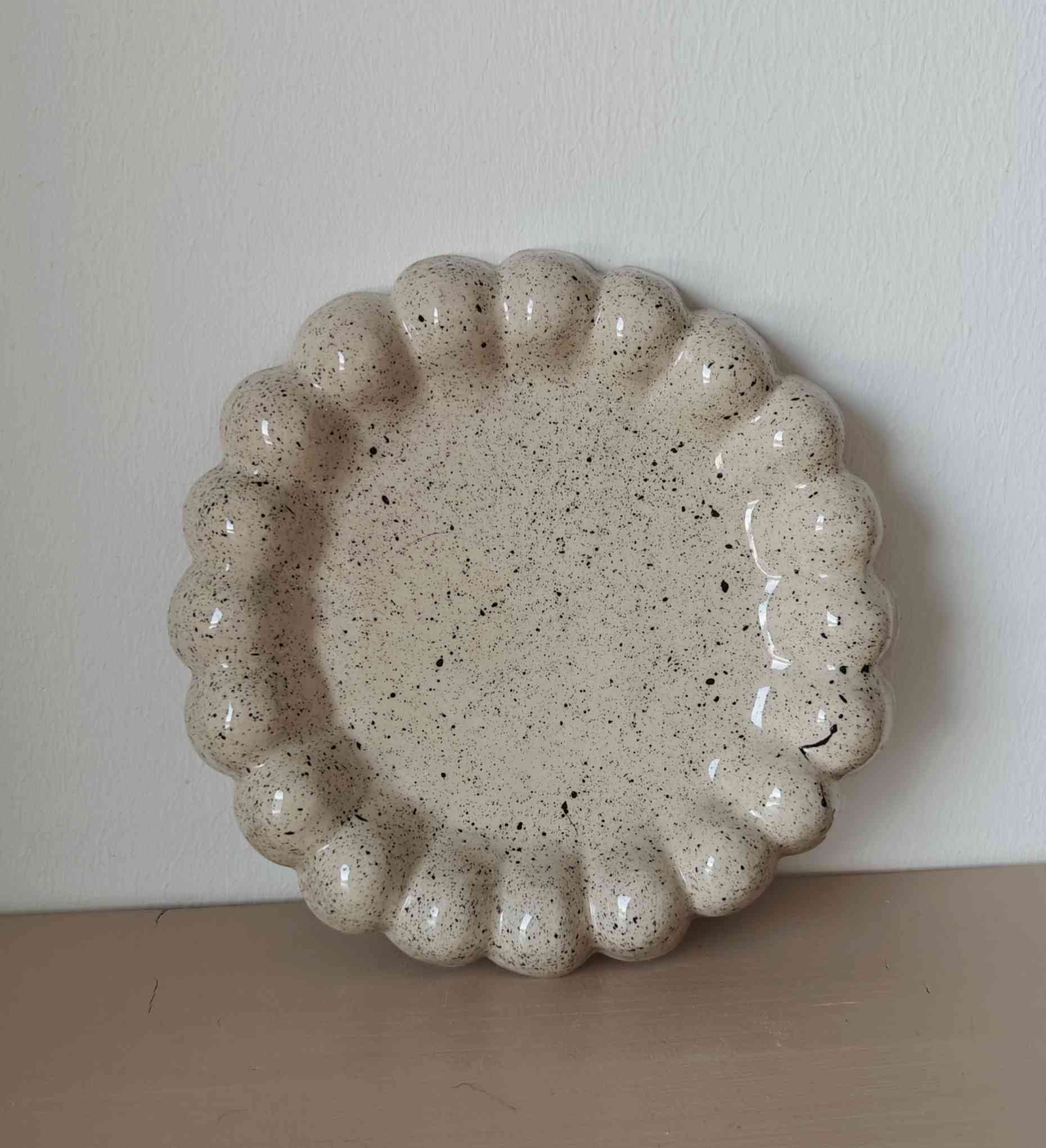 Käsin valusavesta valmistettu lautanen. Lasitettu kirkkaalla elintarvikekättöön soveltuvalla lasitteella. Halkaisija n. 22cm