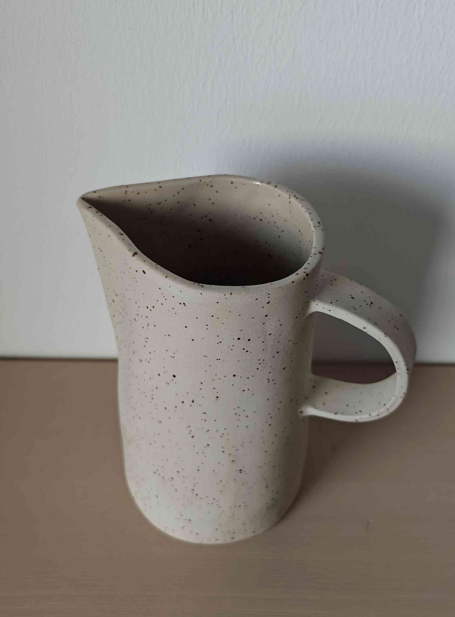 Käsin tehty kannu pilkkusavesta. Sisäpinta lasitettu kirkkaalla lasitteella. Tilavuus noin 1L