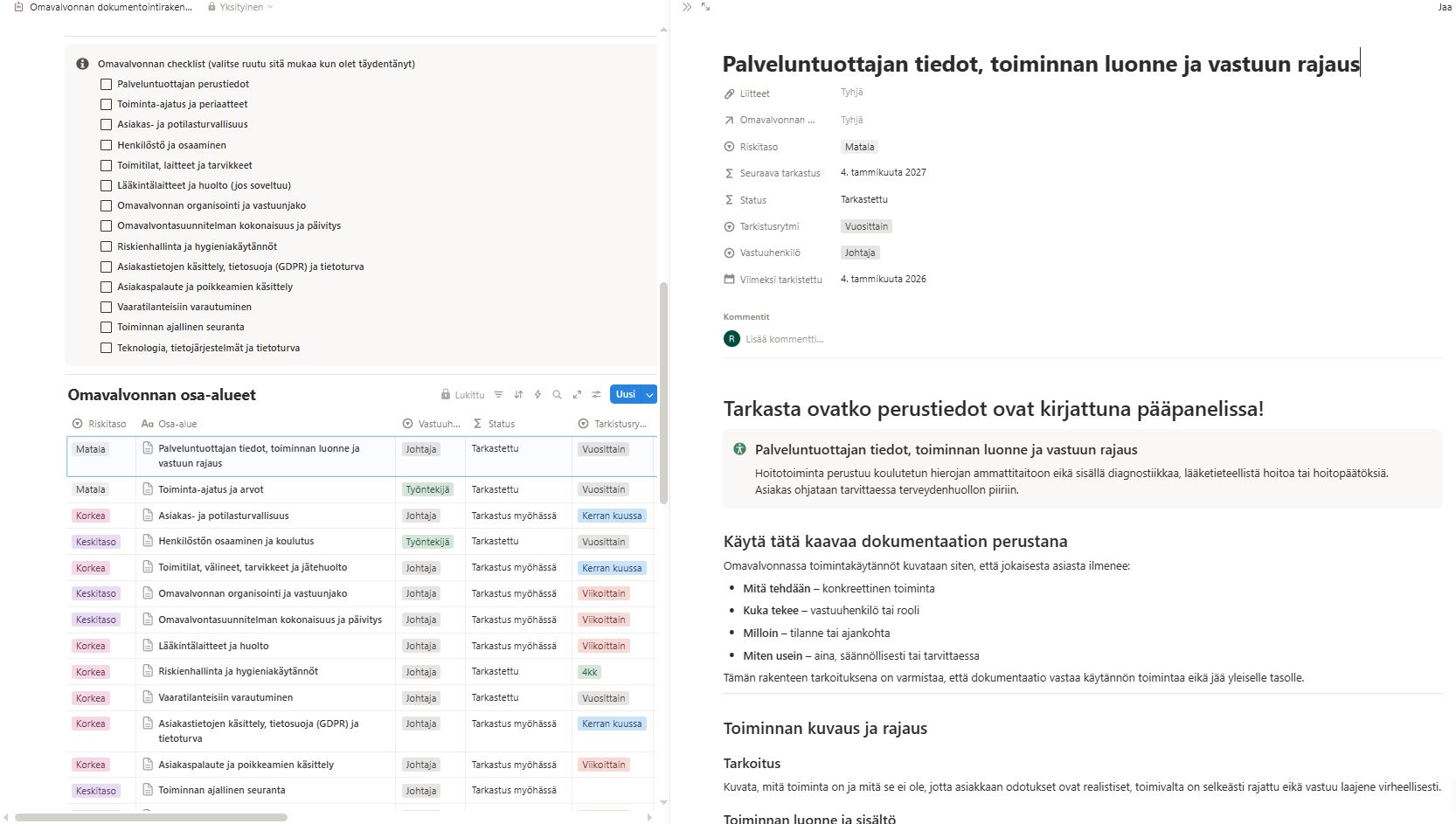 Dokumentointirakenne, joka tekee näkyväksi omavalvonnan, vastuun ja kirjaamisen ilman jatkuvaa raportointia tai raskasta hallintaa.
