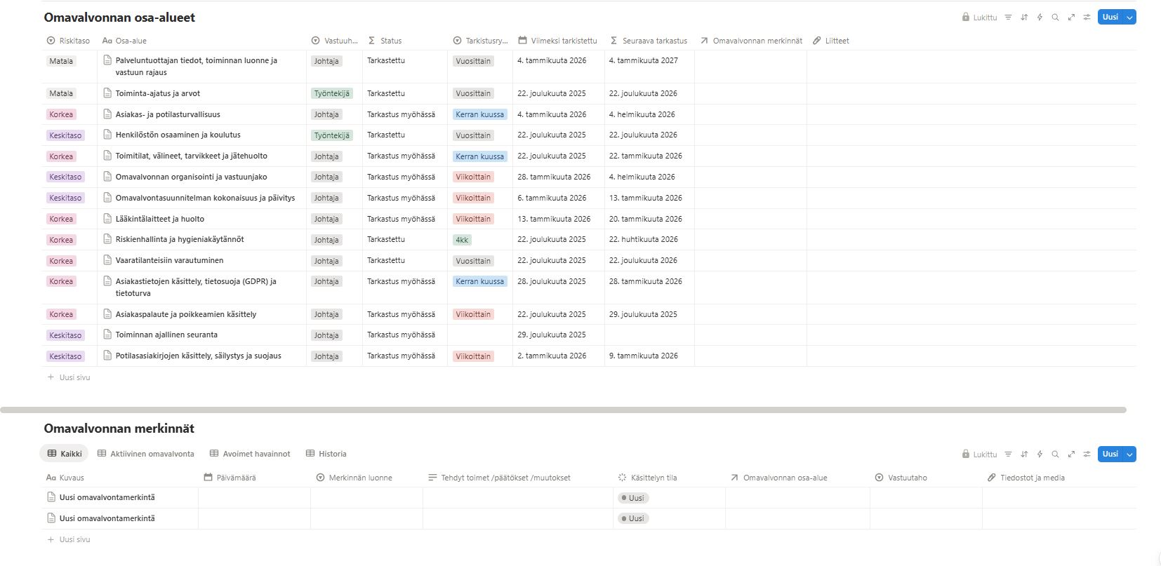 Asiakas vastaa itse omavalvontasuunnitelman ja muun dokumentaation sisällöstä, ajantasaisuudesta ja käytöstä omassa toiminnassaan. Myyjä ei käsittele, säilytä tai seuraa järjestelmään tallennettuja tietoja.