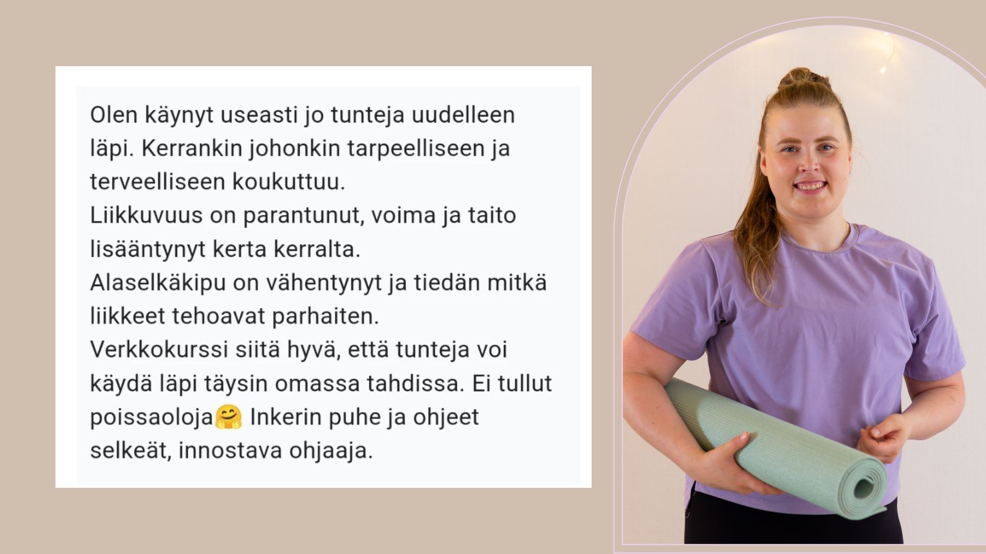Tämän kurssin avulla opit pilateksen perusasiat. Sinun ei tarvitse olla notkea, teet liikkeet turvallisesti sinulle sopivalla tasolla. Saat selkeästi ohjatut videot kerran viikossa + infovideon. Vaihtoehtoja, joista valitset itsellesi sopivan. Pilatesharjoitukset ovat suunniteltu sopimaan niin aloittelijoille, tauolta palaaville kuin pilatesta jo harrastaneille. Sinä valitset minkä vaihtoehdon liikkeestä teet. Pilateskurssi ei vaadi aikaisempaa osaamista ja voit aina kysyä pilatesohjaajalta apua liikkeisiin.