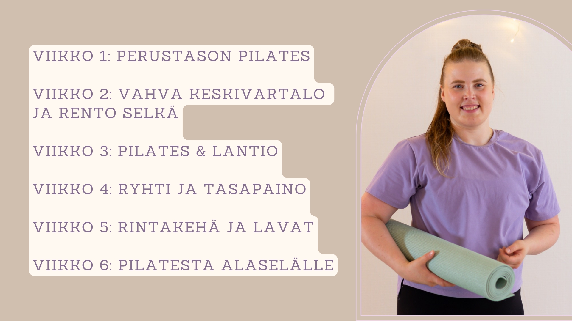 Tällä 6 viikon pilateskurssilla saat kattavat ohjeet harrastaa pilatesta kotona. Kurssi sisältää 6 pilates harjoitusta: