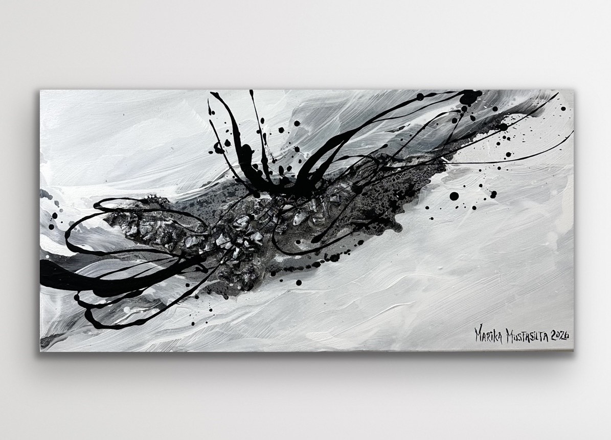 Teos koostuu mustan ja valkoisen tanssista paletilla. Pinnan kaunis tekstuuri kutsuu koskettamaan ja tutkimaan, mutta teoksen todellinen salaisuus on sen hienovarainen hopeinen kimallus. Tämä heijastus ei ole vain koriste, vaan se symboloi sielun hienointa energiaa – sisäistä totuutta, joka valaisee läpi kaiken. Sydän on ankkurisi kohti oman voimasi ydintä. Se muistuttaa, että suurin periksiantamattomuuden voima löytyy usein hiljaisuudesta ja kirkkaudesta. Teos on luotu tuomaan kotiisi hyvää energiaa ja maadoittunutta voimaa. Se kutsuu sinut rauhoittumaan ja kuulemaan oman sisäisen viisautesi, joka on kirkkain, kun sielu lepää omalla huipullaan. Tämä teos on julistus siitä, että kaunein totuus ja suurin voima löytyvät aina sydämen keskuksesta. Koko 50x100cm. Sekatekniikkateos; Akryyli kankaalle & poltettu puu, hiili ja glitter. Hinta sisältää toimituksen Suomessa.