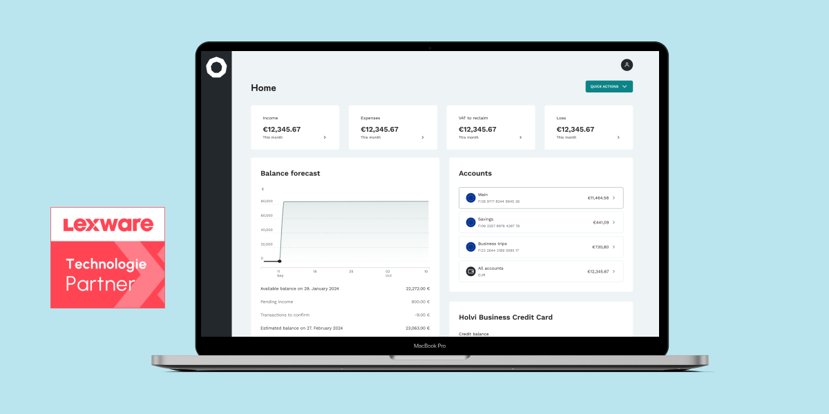 Mit der Integration von Holvi und Lexware Office werden alle Transaktionsdaten deines Geschäftskontos, inklusive Kartenzahlungen, in Echtzeit an Lexware Office übertragen. Transaktionen der Holvi Kreditkarte werden dabei als separates Konto in Lexware Office angezeigt.