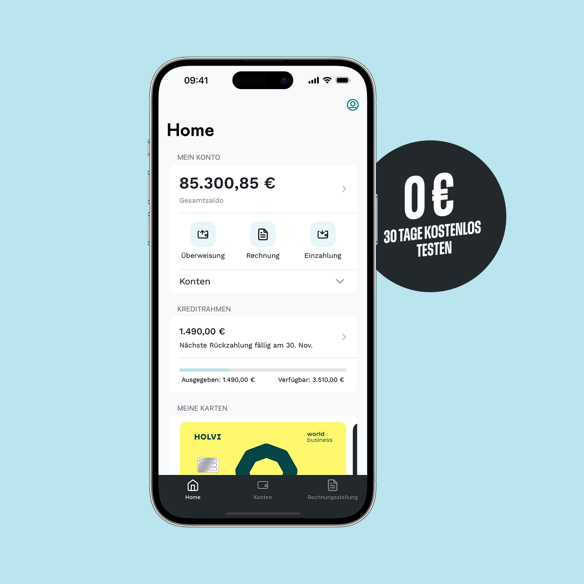 Deutsche IBAN, Buchhaltungsschnittstellen, Debitkarten und Kreditkarten bis zu 50.000 € Kreditrahmen. Teste Holvi 30 Tage lang kostenlos.
